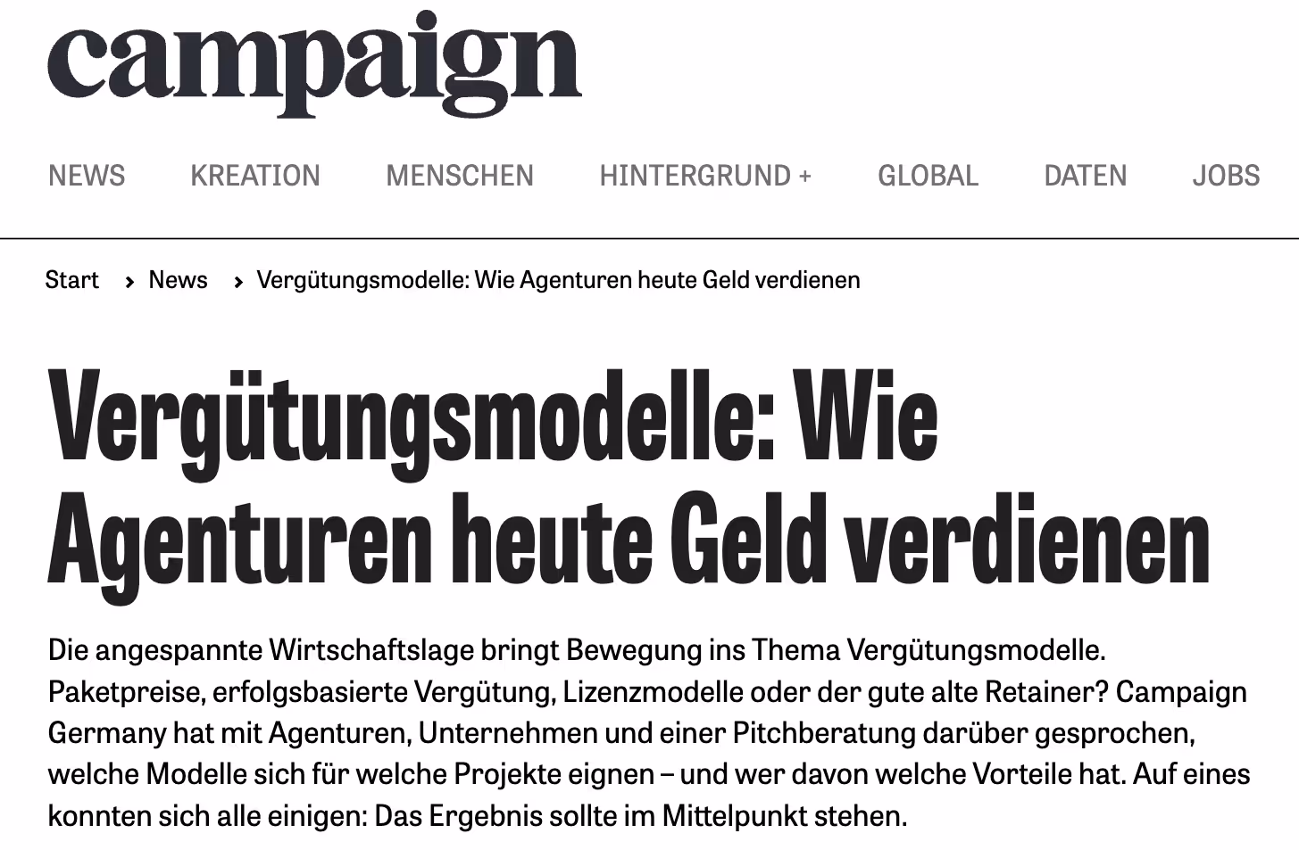 Im neuen Artikel "Vergütungsmodelle: Wie Agenturen heute Geld verdienen" vom April 2025 der Campaign Germany gibt unser CPO Sebastian Druschel Lösungsvorschläge zu den finanziellen Herausforderungen von Agenturen.
