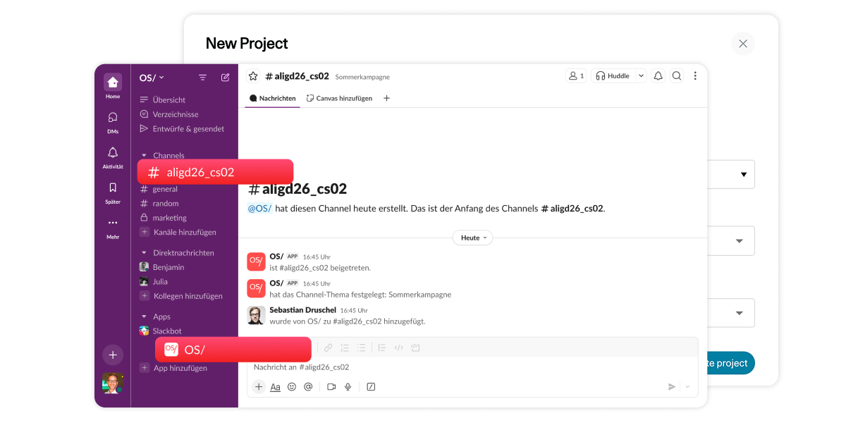 As soon as you create a project in OS/, the integration automatically creates the appropriate Slack channel.